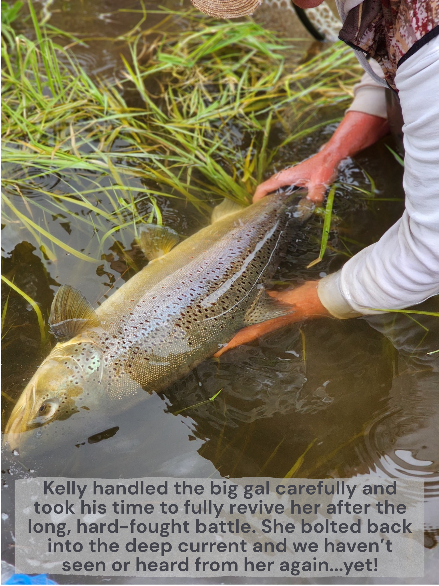 The monster trout’s next move has Kelly shaking his head in disbelief to this day. With the bare spool of Bob’s reel visible under the fly line backing, the fish turned in a huge eddy and immediately charged back upstream into the tank she had just vacated. “I dropped the anchor right at the same spot as before,” Kelly laughs, “and then Bob retrieved his line and went back to work. If she hadn’t made that U-turn, I’m pretty sure it would have been over.”